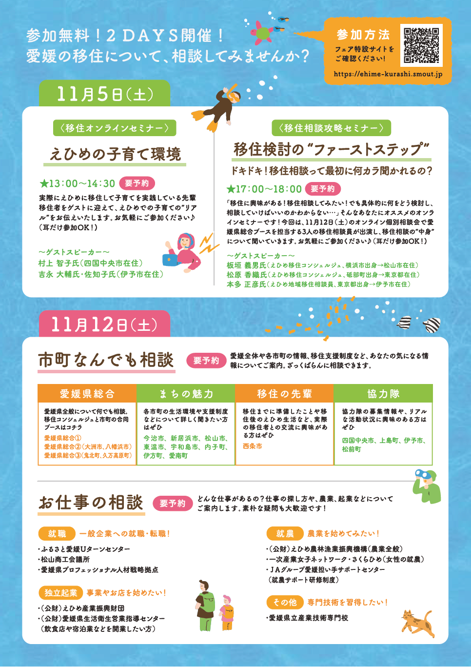 11月5日(土曜日)、愛あるえひめ暮らしフェアにて、ご自宅から参加できる移住オンラインセミナー&移住攻略セミナーを愛媛県が開催します。