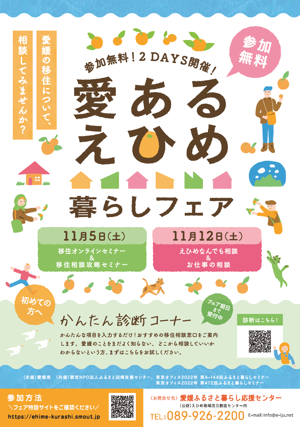 11月5日(土曜日)、愛あるえひめ暮らしフェアにて、ご自宅から参加できる移住オンラインセミナー&移住攻略セミナーを愛媛県が開催します。
