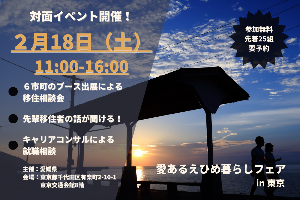 愛媛県内の市町や、移住者の受け入れを行っている地域団体が集まる初めての愛媛県単独の移住フェア「愛あるえひめ暮らしフェア」が開催されます。