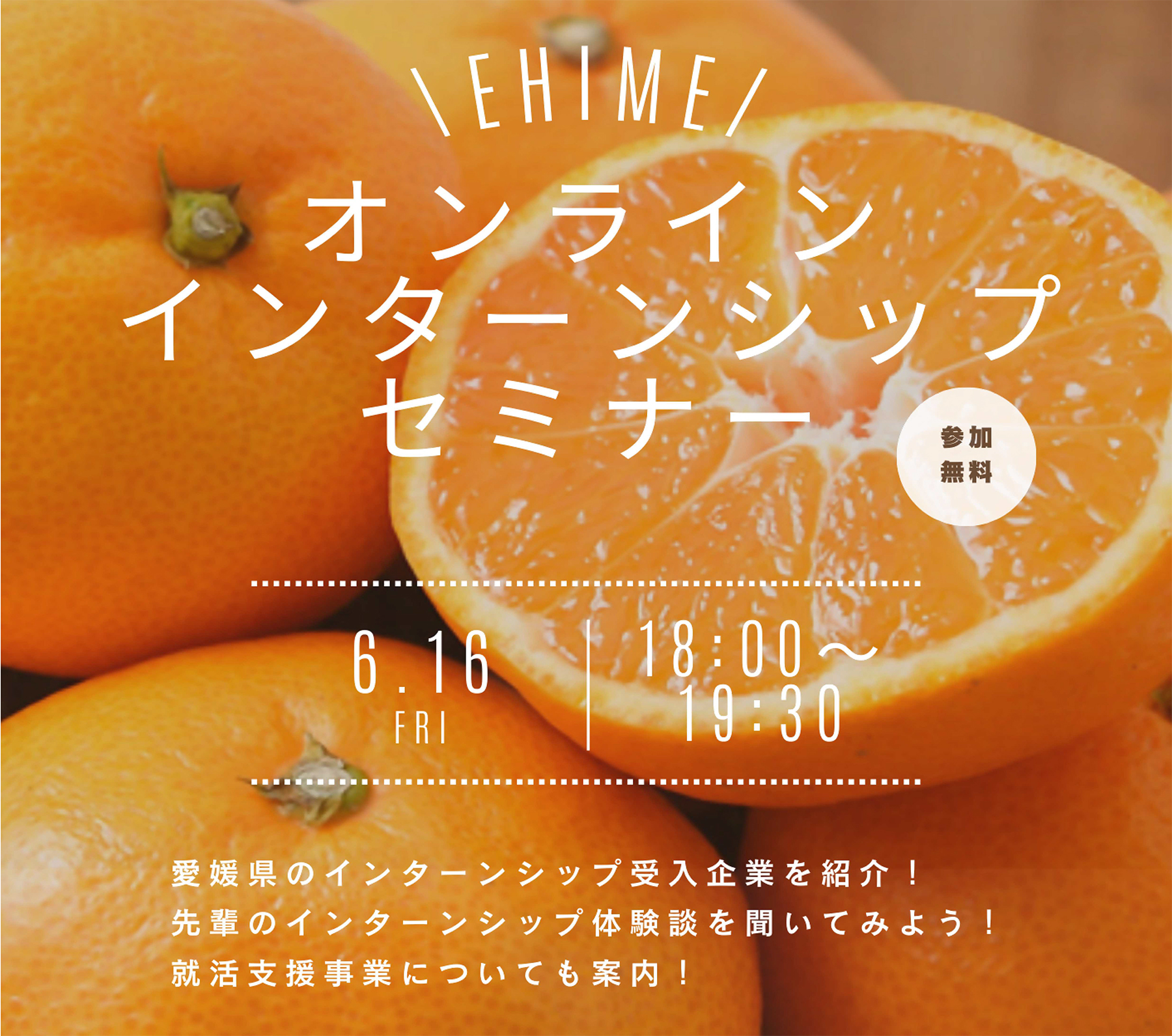 愛媛県では、県外への人口流出に歯止めをかけ、県内企業の人材確保を図るため、 下記のとおり、えひめオンライン 「インターンシップセミナー」を行うを実施します。 愛媛でのキャリアプランを決める手がかりを発見する良い機会となりますので、 「愛媛で働く・暮らす」ことに興味をお持ちの方は是非、ご参加ください。
