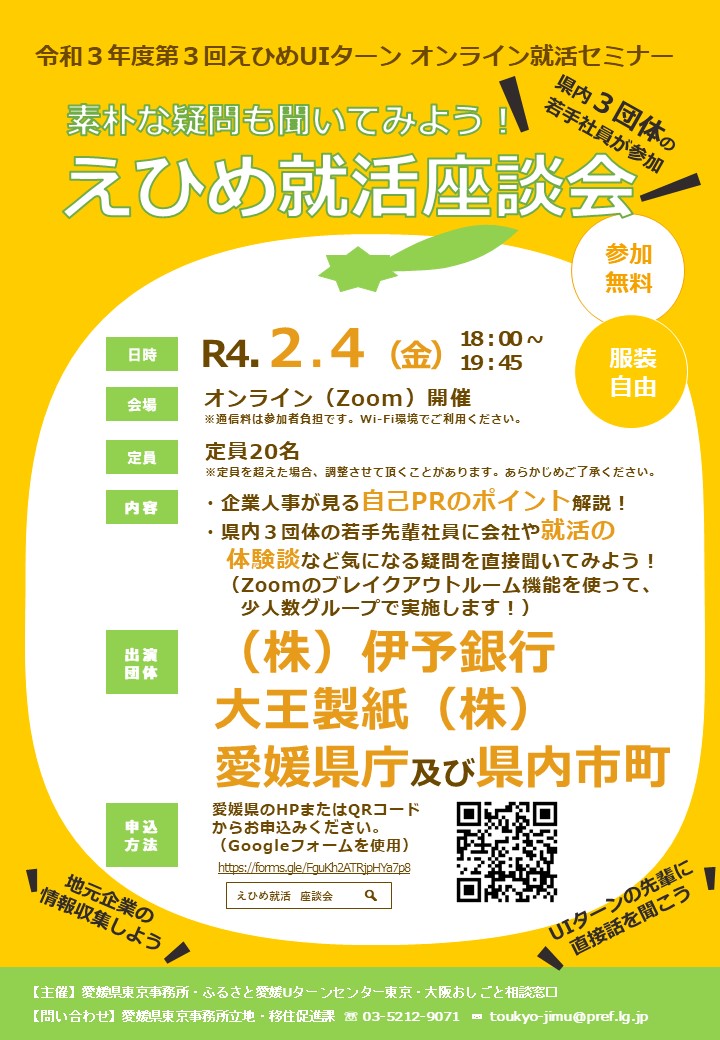 就職を機に愛媛に帰りたい、行ってみたいと考えている学生の皆さんを応援するため、愛媛での就職活動に役立つ情報満載のセミナーをオンライン(Zoom)で開催します。